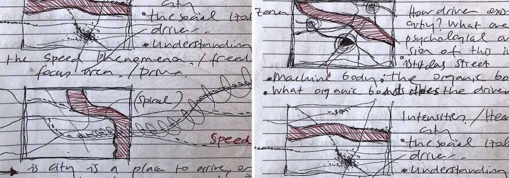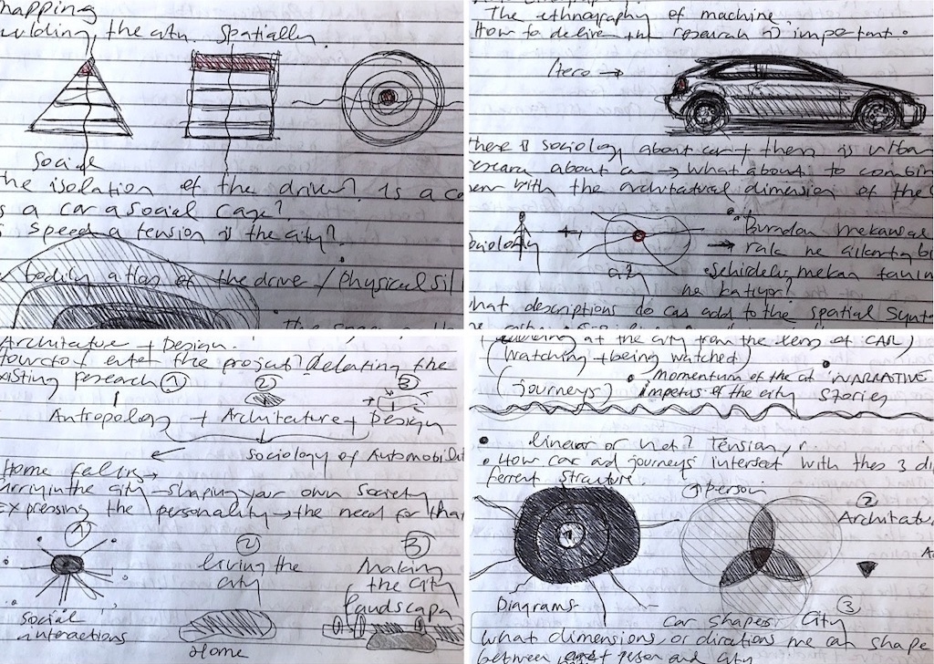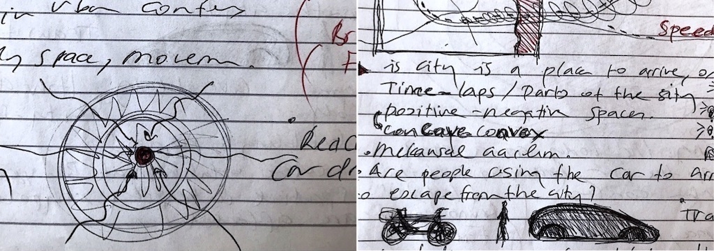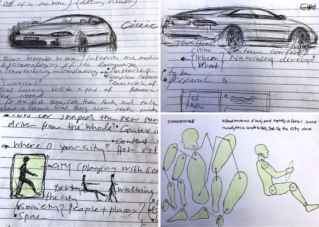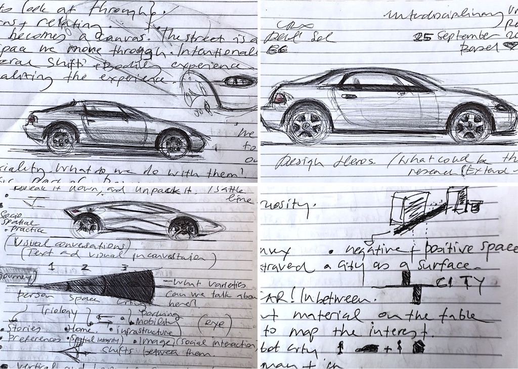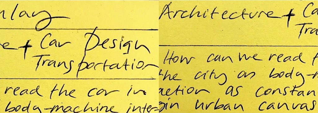 IUR 2024, first class, first thoughts: How can we read the car in the city as a body-machine interaction within a constantly changing urban canvas and space? Exploring overlapping subjectivities by mapping an object—the car—onto something much broader.