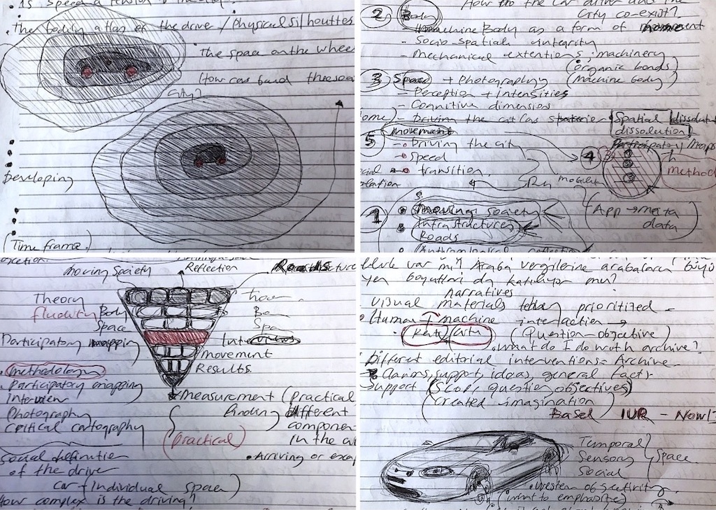 For the spatial cartography, the research will incorporate three additional methods with each selected architect: participatory mapping, interviews, and photography. Using city maps—likely of Basel, Zürich, and Lausanne—prepared at different scales along with a small map of Switzerland, participant architects will be asked about their physical, spiritual, and intellectual experiences, comments, and impressions at the intersection of the car and the city. With minimal intervention, they will be given the freedom to shape the discussion. This process will operate as qualitative research. The data collected will be integrated into the research alongside the drawings made on the map, the narrated versions of the interviews, empirical data, and observations. Photographs taken during the interviews, with due attention to privacy, may also be included, as well as other supplementary visuals. The participatory mapping method in this research should not be seen merely as a tool for gathering data about car drivers but rather as "a field to work in and on" that can reveal new possibilities and potentials in terms of the socio-spatial connections of the city. In later stages of the research, this data will be used to develop a conceptual framework for a spatial cartography project—a conceptual and methodological approach that unites theory, design, and practice between architecture and cars. Drawing from cars and extending beyond architecture, this cartography is not only about physicality but also emotions, memories, experiences, perceptions, attachments, and identities within a moving space. It represents an imagination shaped by utopian views—an allegory of representation and semantics, both graphic and artistic. By examining these practices, the correlation between social, spatial, and technological traces can better illustrate approaches to intimate spaces, where cars unpack their own features as architectural units on an urban scale.