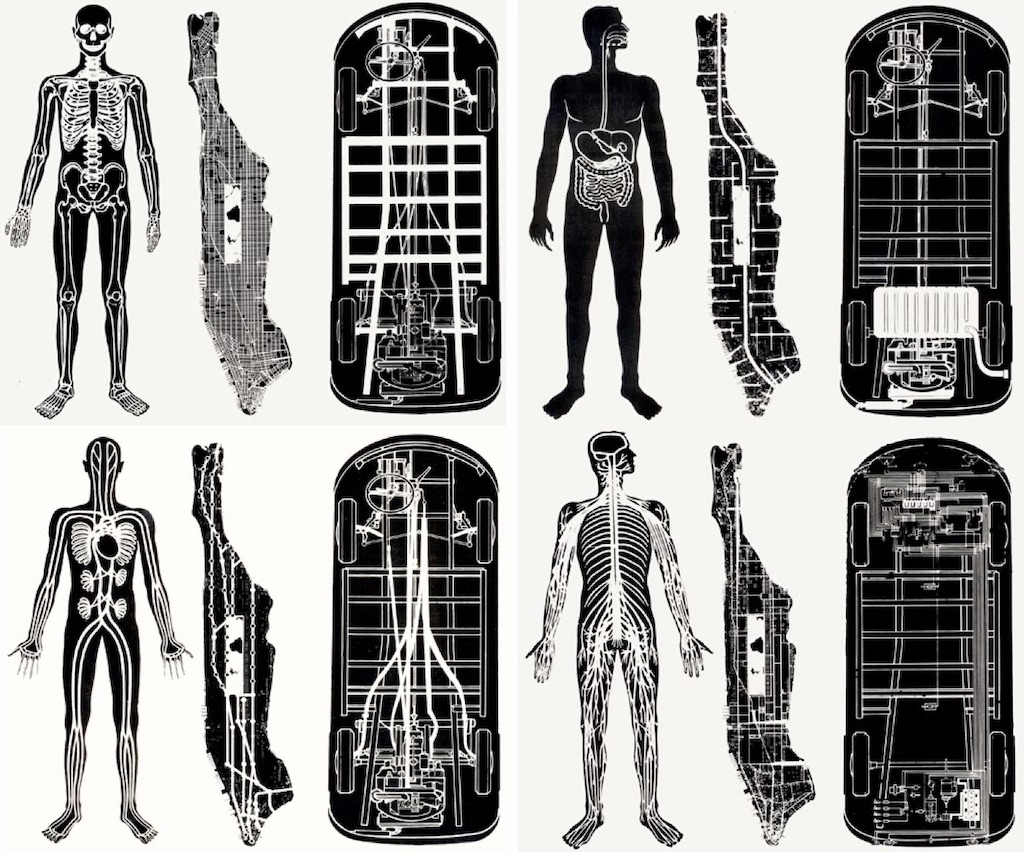 A synthetic discourse emerges from the interplay of three elements: maps, metaphorically revealing images, and titles that explore the conceptual dimension arising from the juxtaposition of two visual elements. In the following examples, Ungers juxtaposes the urban structure of Manhattan with human and mechanical systems to illustrate their visual connections (Socks Studio):